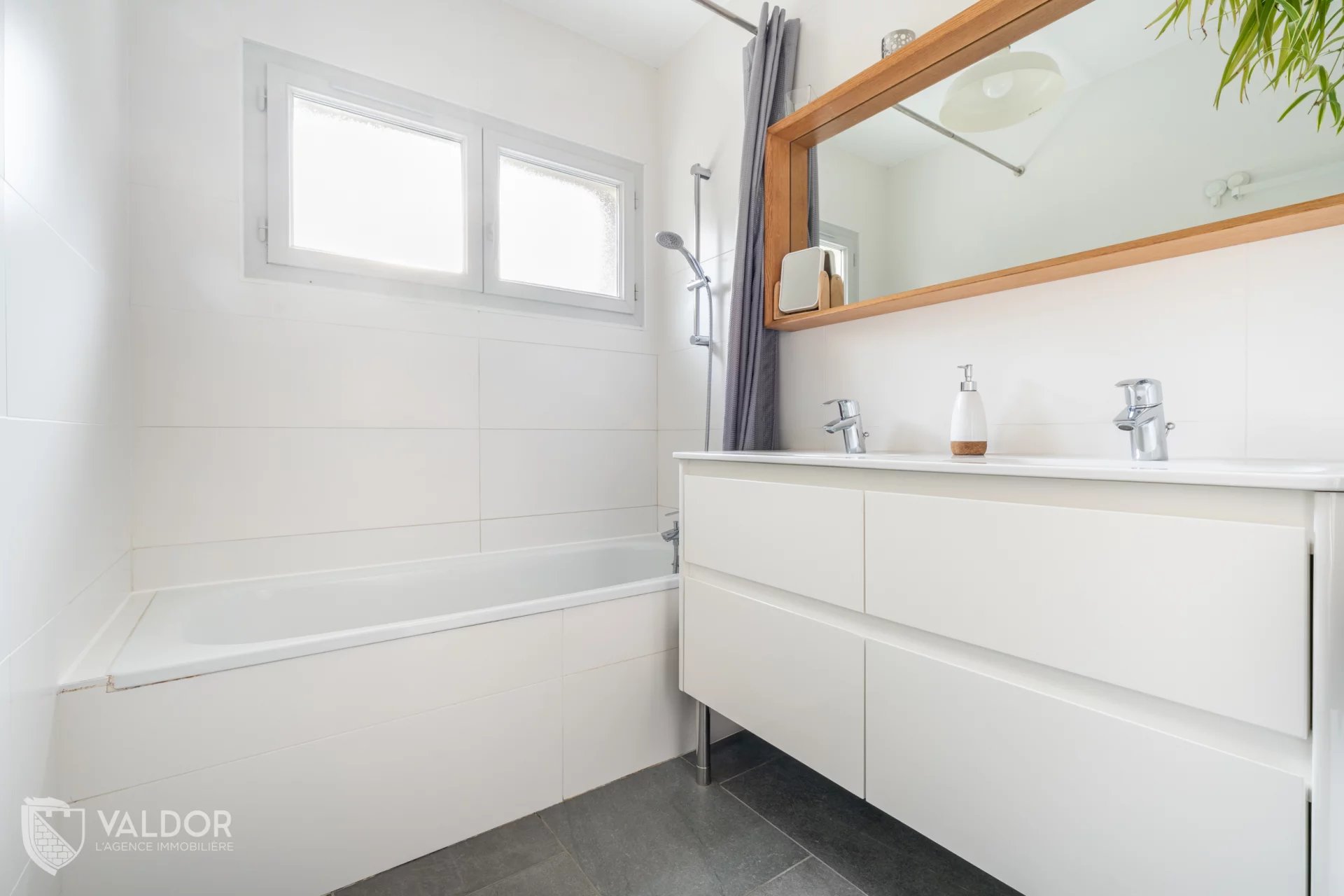 Un WC indépendant et une salle de bains avec baignoire complètent cet espace.