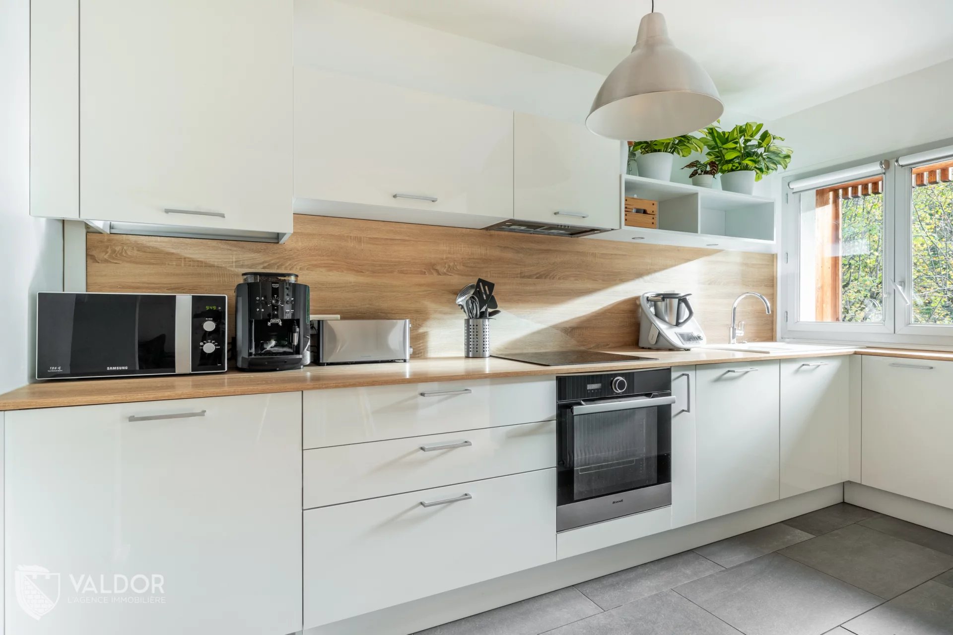 Son agencement est particulièrement fonctionnel : l’espace de vie offre un séjour spacieux et lumineux, ouvert sur une cuisine moderne. Une arrière-cuisine permet d’y installer les équipements volumineux (réfrigérateur, sèche-linge) tout en offrant un espace de rangement supplémentaire.