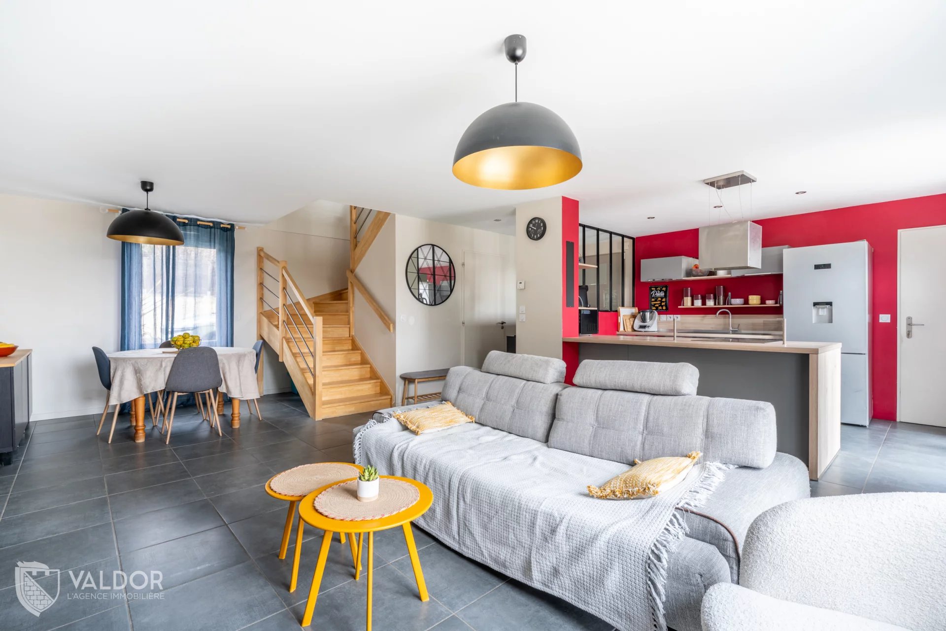 Au rez-de-chaussée, l’entrée ouvre sur une pièce de vie de 41 m², lumineuse, avec cuisine entièrement équipée ouverte sur le séjour.
