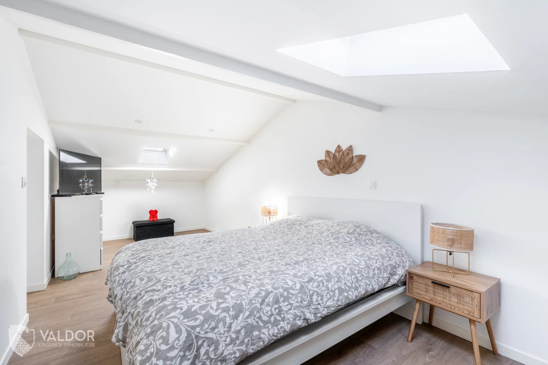Au niveau principal, une pièce de vie de 43 m² avec cuisine ouverte sur le séjour. Un volume généreux, offrant une vraie sensation d’espace. Une première chambre de 12 m², une salle de bains et des WC complètent ce niveau.