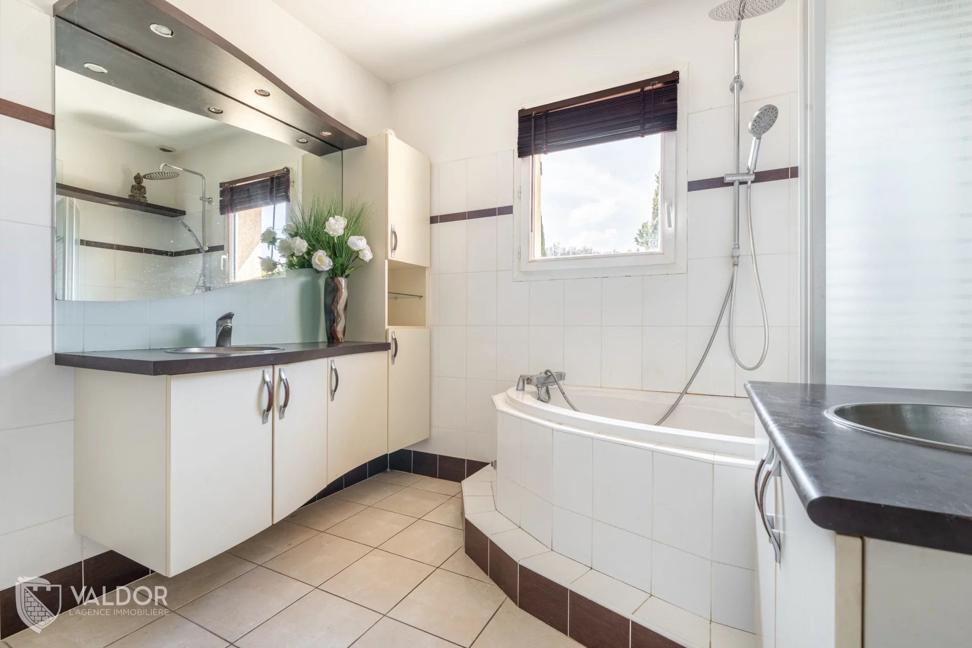 Cet ensemble profite d’un accès direct sur les extérieurs : côté Est sur le jardin, équipé d’un spa et d’un sauna, et côté Ouest sur une terrasse en béton, laissant la possibilité d’y réaliser le revêtement de votre choix.