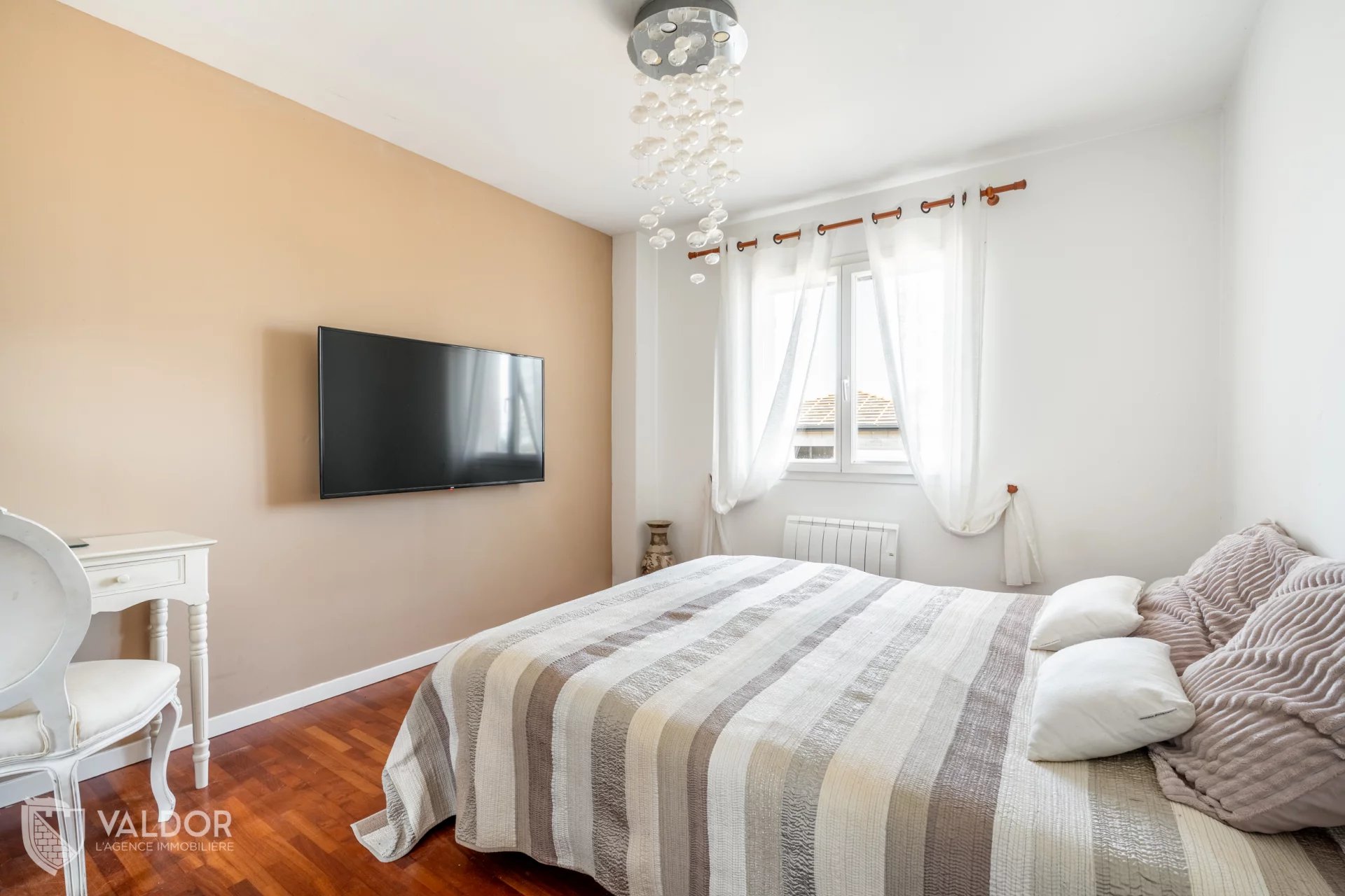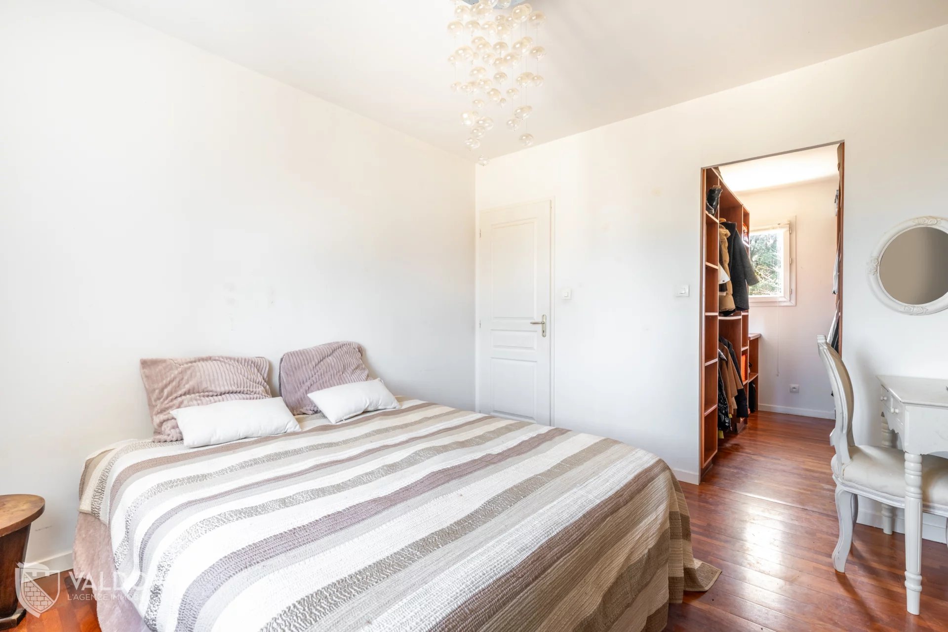 À l’étage, on retrouve deux chambres de 16 m² et 11 m², dont une équipée d’un dressing sur mesure, ainsi qu’une grande salle de bain avec baignoire et toilette. Depuis ce niveau, la vue est particulièrement agréable, ouverte sur les Monts d’Or et les vastes champs environnants.
